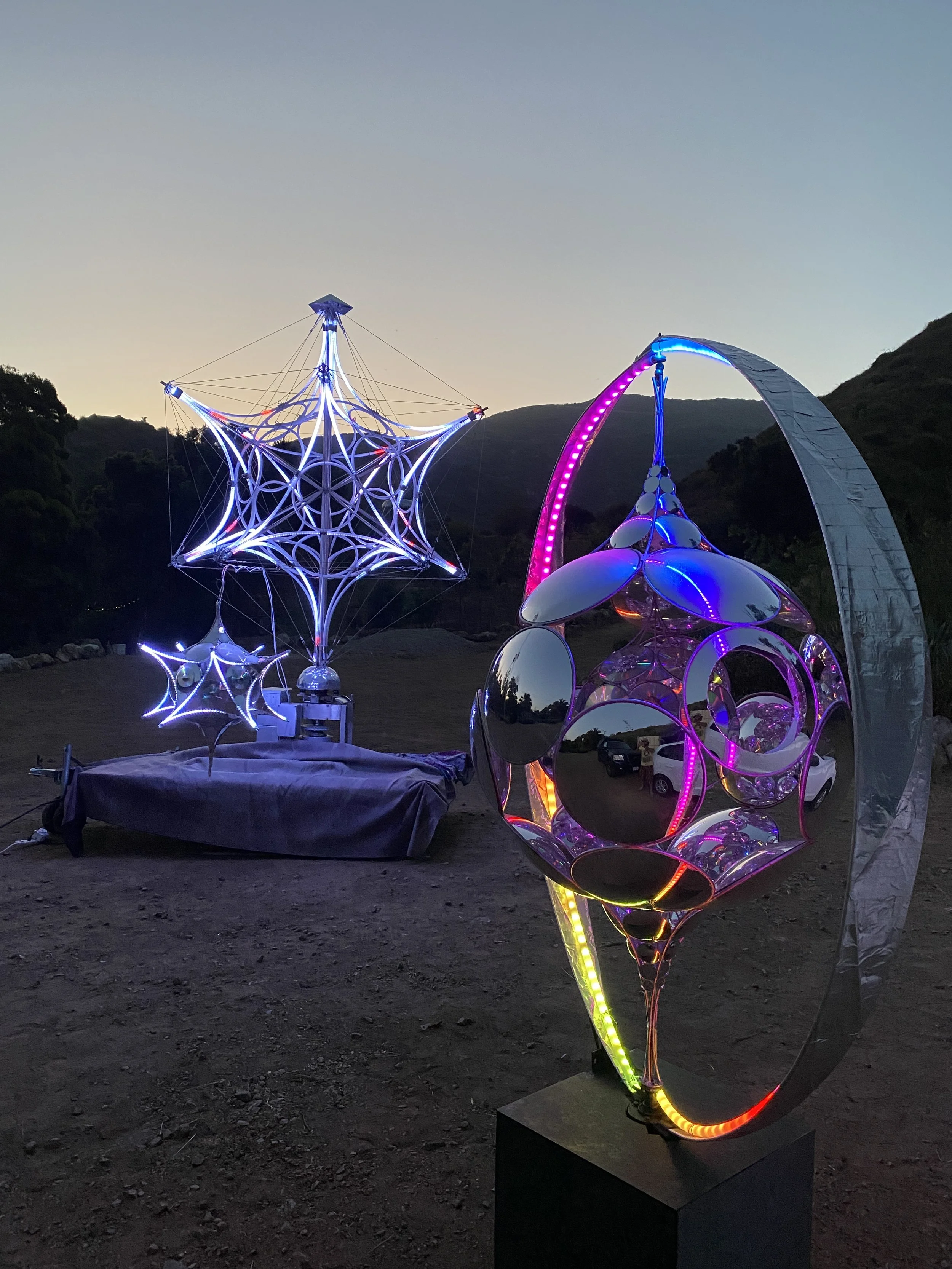 The Cosmic Urchin MirrorSphyr is a 3ft spiked sphere with programmed Leds and spins inside a 10ft tall copper Nubian pyramid. Available for rent. See photos/videos below.