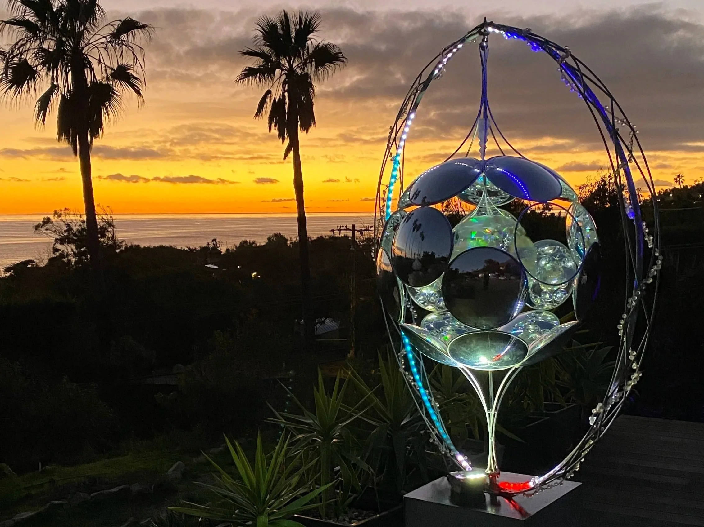 The BluRey AllSphyr is built with stainless steel framework. The outer AllSphyr has 40, 12” acrylic convex mirrors with smaller glass mirrors and rhinestones, and spins in either directions with a belt driven motor. The inner AllSphyr has 40 blue ray dvds, glass mirrors and rhinestones, and has an adjustable speed direct drive motor which gives it a holographic look and feel. An incredible sculpture for visuals both night and day. The dvds make direct sunlight blast rainbows all over any space, and at night, the circular arches give a totally different feel with the programmable LEDs. Shoot spotlights and lasers into the center to really create an unbelievable scene.